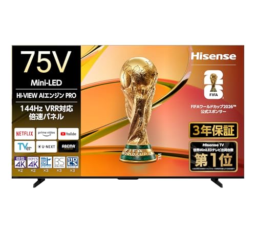 【Amazon.co.jp限定】ハイセンス75V型4K Mini LEDテレビ。Mini LEDバックライトで明るく高コントラストな映像を実現します。