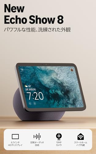 最新モデルのAmazon Echo Show 8は、シームレスな新デザインが美しい8.7インチHDスマートディスプレイです。