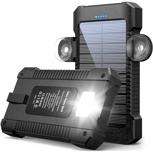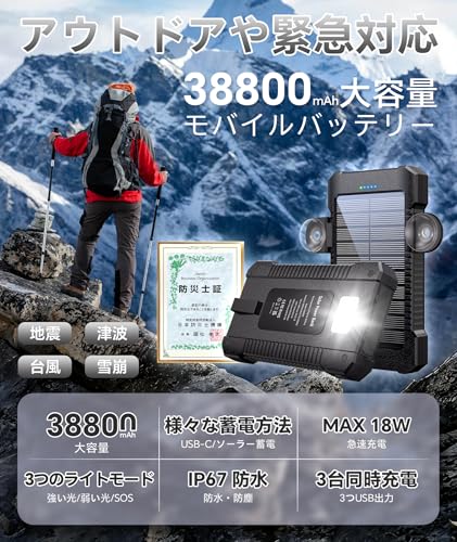 ソーラーモバイルバッテリー 大容量【38800mAh & PD18W急速充電】4ポート出力対応・高効率ソーラーパネル内蔵・高輝度SOS LEDライト付きモデル 防災グッズ ・アウトドアに最適な多機能ソーラー充電器(ブラック)