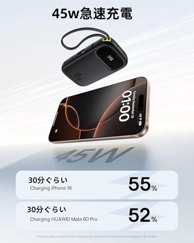 Baseus モバイルバッテリー 45W USB-C 内蔵 ケーブル付き 10000mAh 急速 USB-Cケーブル iPhone17/16 Galaxy スマホ 対応 PSE認証済 EnerFill FC31