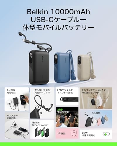 Belkin BoostCharge モバイルバッテリー ディズプレイ付き (10000mAh 20W USB-Cケーブル内蔵) 最大20W PD高速充電対応 PPS対応 iPhone&Androidスマホ対応 2台同時充電 PSE認証 軽量&コンパクト 機内持込可能 アウトドア/災害/緊急用の便利グッズ メーカー保証2年 サンドホワイト BPB027fqSD