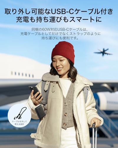 10000mAhの大容量で約2回のフル充電を実現し、内蔵ケーブルとポートで2台同時充電もできます。