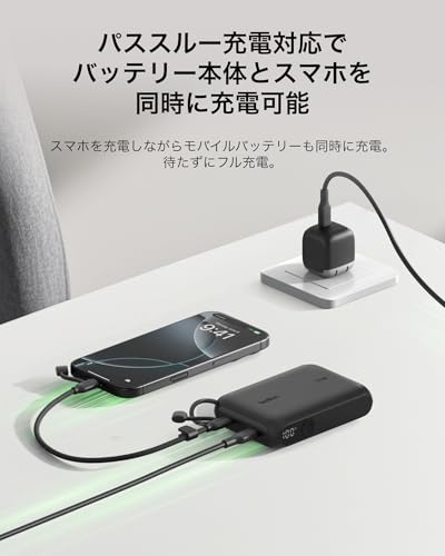 Belkin BoostCharge モバイルバッテリーは、内蔵USB-Cケーブルで最大20WのPD高速充電が可能です。