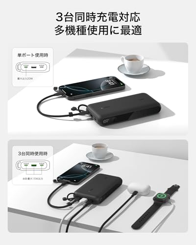 USB-Cケーブル内蔵で、USB-C×2、USB-A×1の3ポート搭載。3台同時充電も可能です。