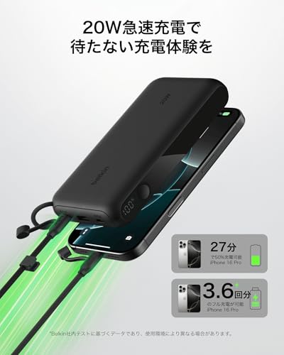Belkin BoostCharge モバイルバッテリー ディズプレイ付き (20000mAh, 20W, USB-Cケーブル内蔵) 最大20W PD高速充電対応 PPS対応 iPhone 17,16~12対応 &Androidスマホ対応 3台同時充電 PSE認証 軽量&コンパクト 機内持込可能 アウトドア/災害/緊急用の便利グッズ メーカー保証2年 サンドホワイト BPB028fqSD