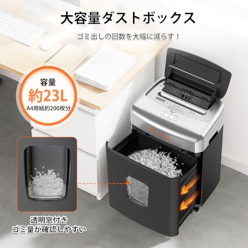 機密情報は4×12mmのマイクロカットで確実に細断。23Lの大容量ダストボックスと紙詰まり低減設計で、メンテナンスも楽々です。