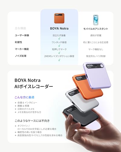 BOYA Notra AIボイスレコーダーは、ワンタッチで録音から文字起こし、要約までを完結する多機能レコーダーです。