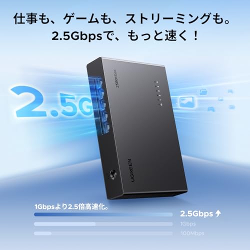 UGREENのスイッチングハブは、全5ポートが2.5Gbpsに対応し、従来の2.5倍の高速通信を実現します。