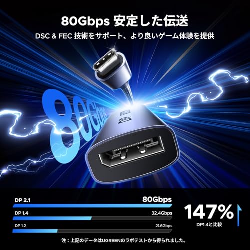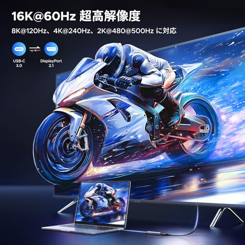 UGREENのUSB-C to DisplayPort 2.1変換アダプターは、最大16K@60Hzという驚異的な高解像度出力に対応しています。