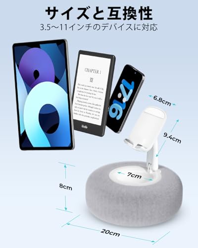 viozon スマホスタンド iphone スタンド 寝ながらスマホ 4.7〜7インチのデバイスに対応 ふわふわミニ抱き枕付き 直径20㎝ 軽量 高さ調整 メガネやAir Pods小物収納 安定性 Kindle読書 動画視聴 携帯スタンド 子供用 グレー