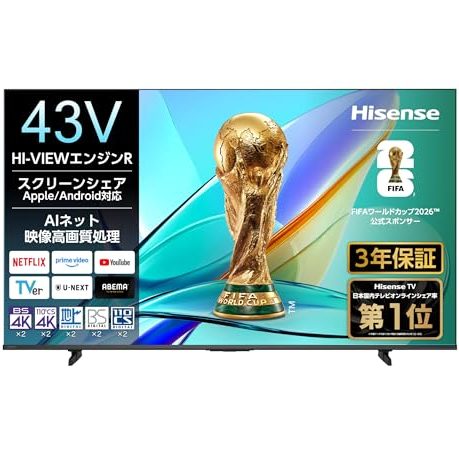 【Amazon.co.jp限定】ハイセンス【3年保証】43V型 43E50R 4K スマート Wチューナー内蔵 ネット動画 液晶 テレビ HDMI2.1 低遅延ゲームモード Alexa AirPlay2 2025年モデル 32%OFF ¥56,800 ¥38,520 428ポイント 1か月前 3月3日13時38分 家電&カメラ 家電&カメラ AlexaAmazon.co.jp限定