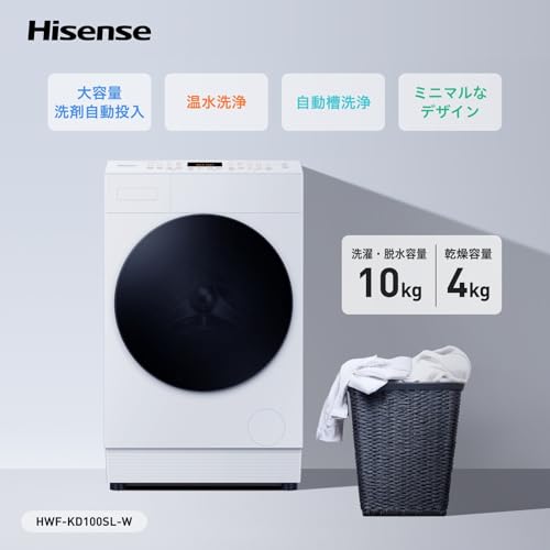 ハイセンス ドラム式 洗濯乾燥機 洗濯10kg 乾燥6kg 洗剤自動投入 コンパクト 大容量 自動槽洗浄 温水洗浄 60℃除菌コース スリム HWF-KD100SL-W ホワイト