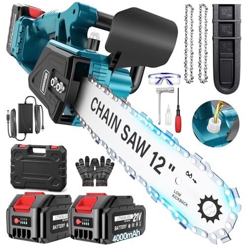 Natsumi チェーンソー 電動 12インチ ブラシレスモーター 充電式チェーンソー マキタ18Vバッテリー対応可能 4.0Ah大容量バッテリー2個搭載 電動ノコギリ チェインそー 切断径350mm 給油可能 電動ちぇーんそー 充電式 家庭用 高速切断 低振動 エンジン ポータブル 枝切り薪作り庭木の剪定 園芸設備 操作便利 収納箱付き 日本語取扱説明書