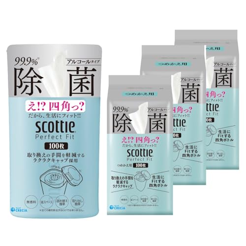 ウェットティッシュ アルコール 除菌 本体100枚+詰替100枚3個 ミストブルー スコッティ パーフェクトフィット (セット品)