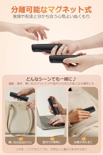 マグネットで2つに分離できるので、1人で両手を温めたり、シェアして使うこともできます。