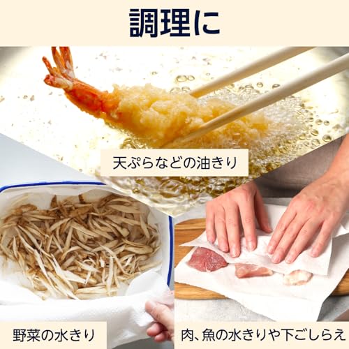 バージンパルプを使用した丈夫なシートで、キッチンの水気や油はねをしっかり拭き取ります。