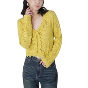フリーズマートの透かし編みクロップドニットカーディガンです。 明るいイエローが春らしい印象を演出します。