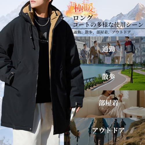 [inotenka] ダウンコート メンズ ロングコート 防寒 厚手 ダウンジャケット 大きいサイズ ベンチコート フード付き ウインドブレーカー 暖かい ゆったり 防風 撥水 アウトドア カジュアル 無地 通勤 おしゃれ 冬服(M ブラック)