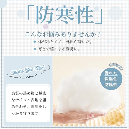 軽量でふわふわの充填物は暖かく、サテン裏地が肌に優しい着心地を実現。