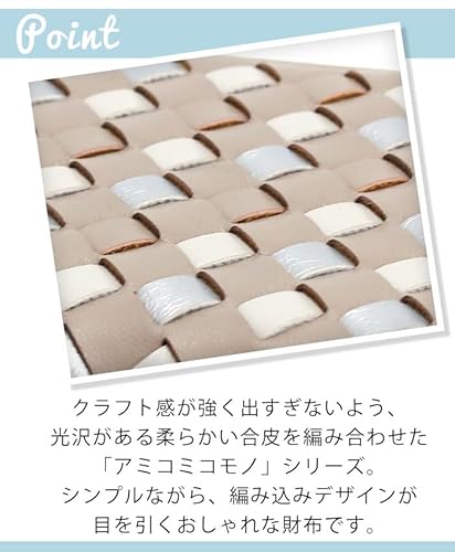AMIKOMIの編み込み折財布は、ポリウレタン製の外装に編み込みデザインが施された、
