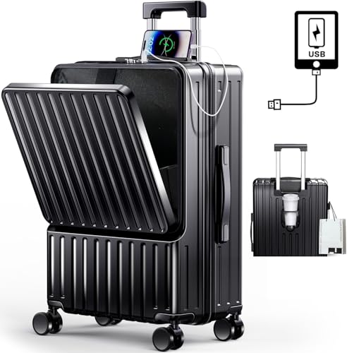 [BARGOHOY] スーツケース フロントオープン 多機能 キャリーケース 軽量 カップホルダー付き 隠しフック機能 ケース キャリー USBポート付き 耐衝撃 静音 360度回転 TSAローク ファスナータイプ キャリーバッグ 人気 おしゃれ 旅行 ビジネス 出張 修学 泊まる 入院 (ブラック, Lサイズ/95L(7泊~長期旅行))