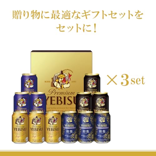サッポロビールの最高峰「ヱビス」の4種類を楽しめる飲み比べセットです。350ml瓶が12本入ったギフトセットが3セット、合計36本の大容量ケース販売となっています。超特価で提供され、9000円相当の価値がある商品です。賞味期限は2026年10月までと長めで、まとめ買いに最適です。ギフト用の熨斗対応はできませんので、ご注意ください。