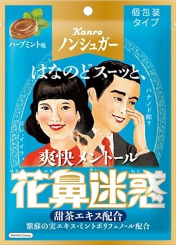 花粉の季節の不快感を和らげる、カンロのノンシュガーはなのど飴です。