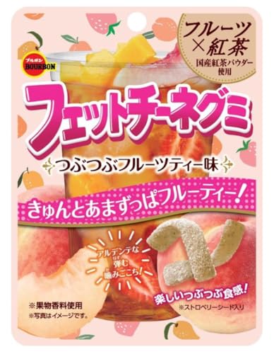 ブルボン フェットチーネグミ ツブツブフルーティ味は、ピーチ風味をベースにマンゴーとストロベリーを組み合わせたフルーツティー味のグミです。