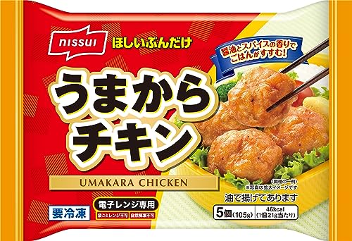 ニッスイの「うまからチキン」は、5個入りが6パックの大容量セットです。冷凍で保存でき、簡単調理でお弁当のおかずやおつまみに便利です。しょうゆとにんにくを効かせた旨味たっぷりの味わいで、サクッとした衣が特徴です。原材料には小麦・卵・大豆・鶏肉を含みます。タイ産です。