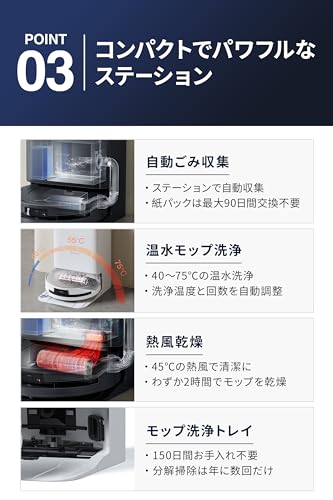 壁際やコーナーにもモップが自動で伸び、99%の清掃カバー率を実現。AIが障害物を認識して衝突を回避し、髪の毛の絡まりも防止する設計で、メンテナンスも簡単です。カーペットにも賢く対応し、全自動で清潔な床を保ちます。