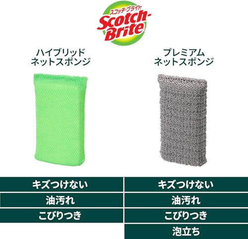 3M スコッチブライト ハイブリッド ネット スポンジは、2種類のネットで油汚れとこびりつきを同時に落とすハイブリッド設計。