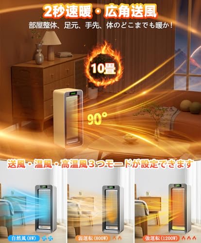 【LEDディスプレイ1200W 超パワー】セラミックヒーターは、1秒で温風が出る速暖性が魅力です。