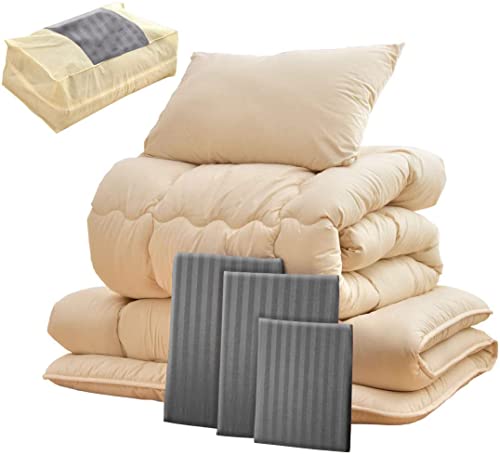 タンスのゲン 布団セットは、シングルサイズの掛布団、敷布団、枕にカバーと収納ケースが付いた7点セットです。