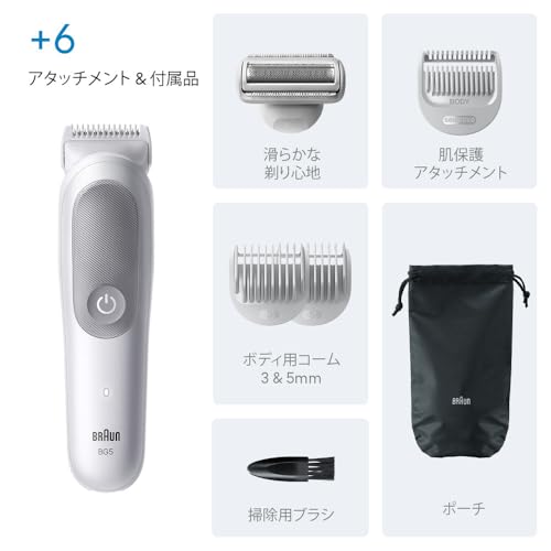 ブラウン ボディグルーマー シリーズ5は、肌を守りながら時短で全身の毛を整えられる男性用ボディ専用シェーバーです。スキンガード搭載で刃が肌に直接触れず、肌を保護しながら剃れます。豊富なアタッチメントで長さ調整が可能で、ボディシェーバーヘッドを使えば密着剃りもできます。防水設計でお風呂場でも使用でき、お手入れも簡単です。