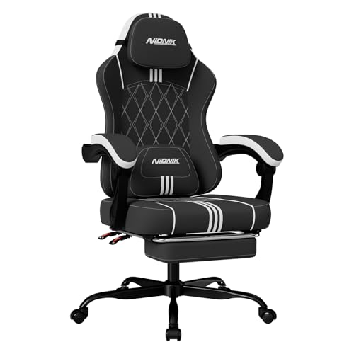 NIONIK ゲーミングチェア ファブリック オットマン付き オフィスチェア デスクチェア 通気性 テレワーク 疲れない 椅子 人間工学設計 連動式アームレスト 145°リクライニング パソコンチェア 幅広座面 座り心地よい 高耐久性 ゲーム用チェア ヘッドレスト&ランバーサポート 簡単組み立て (ブラック)