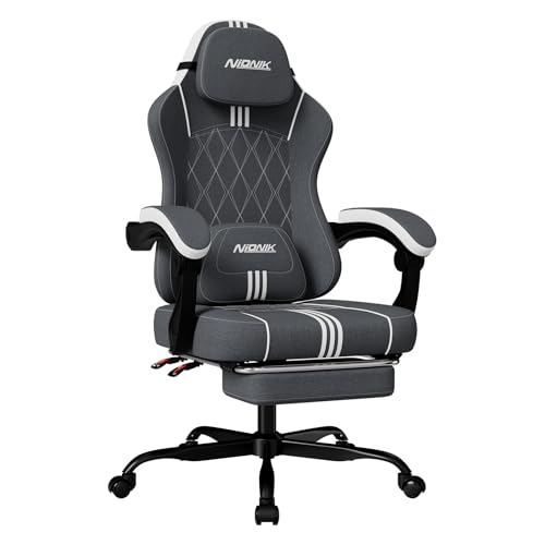 NIONIK ゲーミングチェア ファブリック オットマン付き オフィスチェア デスクチェア 通気性 テレワーク 疲れない 椅子 人間工学設計 連動式アームレスト 145°リクライニング パソコンチェア 幅広座面 座り心地よい 高耐久性 ゲーム用チェア ヘッドレスト&ランバーサポート 簡単組み立て (グレー)