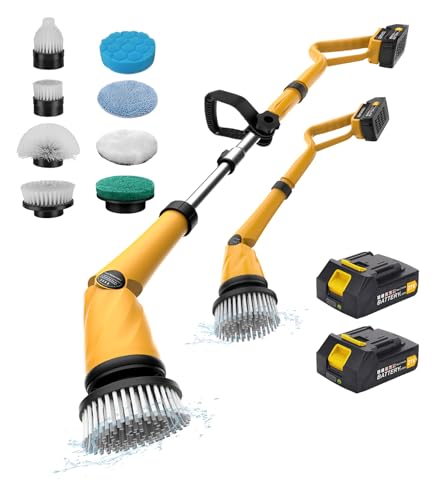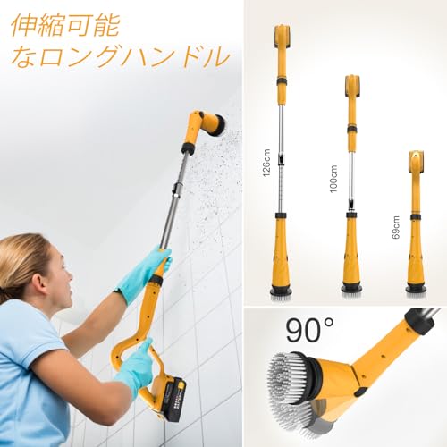 Qimedo 電動お風呂掃除ブラシ 1500回転/分 3段階パワーモード コードレス電動スピンスクラバー 着脱式充電バッテリー(予備バッテリー・充電器付き) 8種類の交換用ブラシヘッド 伸縮式ロングハンドル 浴室 キッチン トイレ 壁 床対応 大掃除に最適