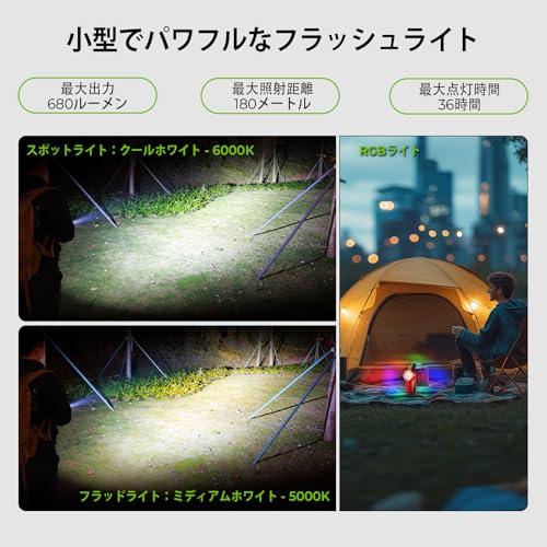 スポット、フラッド、RGBの3光源を切り替えられ、180m先の照らし出しから近距離作業まで対応。