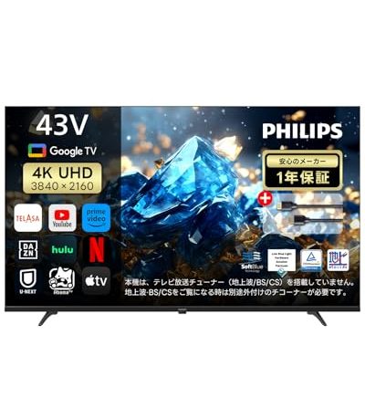 Philips(フィリップス) チューナーレステレビ 43V型 ブルーライトカット 4K UHD スマート テレビ 43インチ Google TV内蔵 HDR10/Dolby Atmos対応 MEMC搭載 ネット動画視聴可能 音声検索対応 HDMIケーブル付き PUH7700 (43型) 33%OFF ¥59,800 ¥39,800 398ポイント 1か月前 2月24日0時29分 家電&カメラ 家電&カメラ