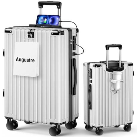 [Augustre] スーツケース 機内持ち込み 超軽量 キャリーケース 大型 軽量 多機能 キャリーバッグ 静音 耐衝撃 ダブルキャスター S/M/Lサイズ カップホルダー付 USB充電機能 隠しフック機能 360度回転 TSAローク搭載 ファスナー式 旅行 ビジネス 出張 (グレー(シルバー), L(7泊~長期旅行/95L))
