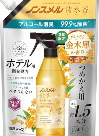 ノンスメル清水香(せいすいか) 金木犀の香り つめかえパウチ 600mL 消臭スプレー 芳香 詰め替え 速乾 ベタつかない 界面活性剤不使用 除菌 服 空間 34%OFF ¥616 ¥405 5ポイント 2か月前 2月5日2時07分 ドラッグストア ドラッグストア
