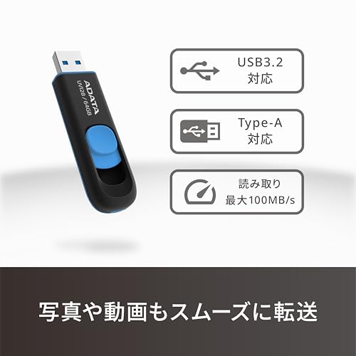 【エイデータ】USBメモリ UV128は、最大読込速度100MB/秒のUSB 3.2 Gen 1対応で、