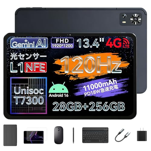 【2026新登場 Android16 タブレットセット】ZPad2 タブレット 13インチ SIMフリー Unisoc T7300 120Hz高リフレッシュレート 1920×1200 FHD大画面 28GB RAM+256GB ROM 11000mAh PD18W急速充電 4G LTE+5GHz WiFi+Widevine L1+顔認識+Gemini AI+GPS対応 光センサー搭載 10点付属品