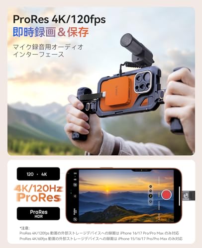 強力なマグネットでスマホやノートPCにしっかり固定。iPhone 15/16/17 Proシリーズで撮影したProRes動画をSSDやSDカードに直接保存可能です。