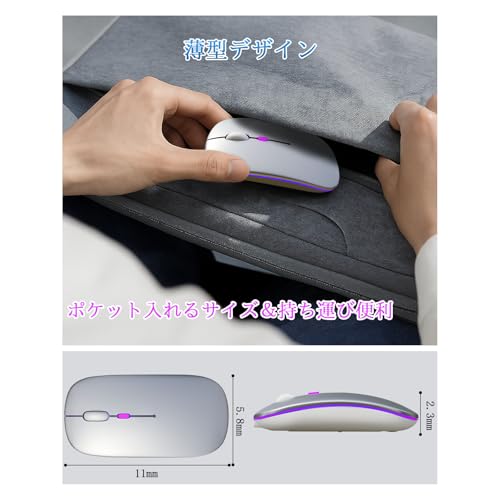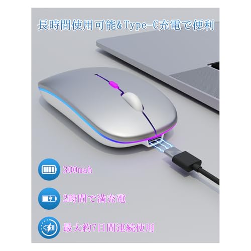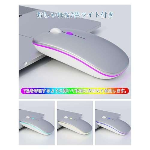 SaikoMausu(サイコマウス) ワイヤレスマウス マウス Bluetooth 2.4GHz 無線 静音 薄型 マウス Type-C 充電式 省エネルギー 3DPIモード 7色ライト付き パソコン PC ipad Mac/Windows/surface/Microsoft Proに対応 silver
