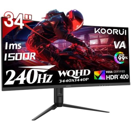 KOORUI 34インチ ゲーミングモニター 曲面ウルトラワイド UWQHD 3440×1440 240Hz 超高速 VAパネル HDR400 高没入感 Adaptive Sync対応 PBP/PIP対応 高さ調整 HDMI2.1/DP1.4 VESA 75*75