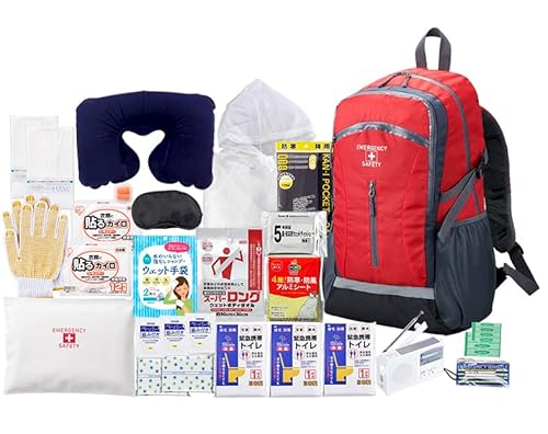 付属のダイナモライトは手回し充電可能で、携帯電話の充電にも対応。防寒アルミシートや緊急トイレ、5年保存のウェットティッシュなど、実用的な防災グッズが揃っています。