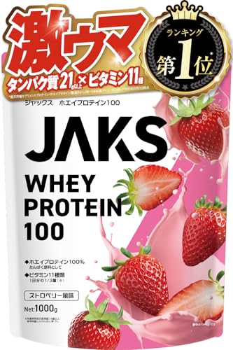 【激ウマ】 ジャックス JAKS プロテイン ホエイ 1kg 国内製造 おいしい 1食分のビタミン11種類 オールインワン配合 高たんぱく質 粉末 WPCプロテイン 溶けやすい (1kg, ストロベリー風味)